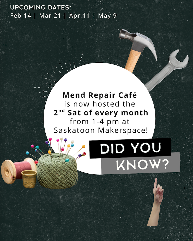 The Mend Repair Cafe is moving to a monthly format. Going forward, it will be hosted on the second Saturday of every month from 1-4 pm at Saskatoon Makerspace. Each monthly Repair Café features a range of repair categories like small electronics, bicycles, woodworking, and fabric & sewing. The events are free to attend, but space is limited so please reserve in advance at www.saskatoonmakerspace.com!